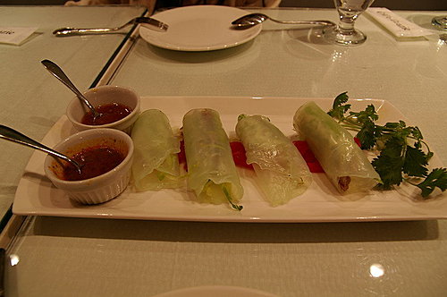 這是阿布點的牛肉涼粉捲,搭配二種sauce,一種酸中帶辣,一種則偏甜,還不錯吃,但牛肉有些老。