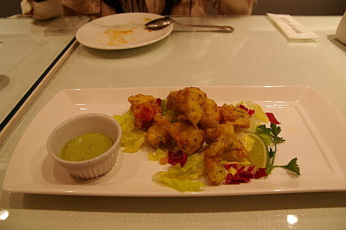我點的炸雞佐蘿勒醬,這蘿勒醬味道和青醬好像,我覺得沾先前的二種sauce比較好吃。