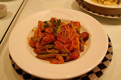辣味雞肉麵-這當中有一小段插曲,第一次他們送錯一盤肉醬麵,第二次送對了,但阿布怎麼翻都找不到雞肉的芳蹤,跟他們反應,服務員說:「是沒有雞肉嗎?」,///-_- !難不成他們常常送上潑有雞肉的辣味雞肉麵???終於他們緊急送上一盤有雞肉的辣味雞肉麵,至於好不好吃,我忘了問阿布了~