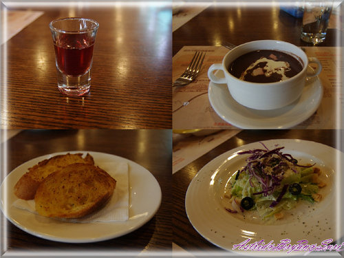 有開胃的玫瑰醋(下圖的左上)、印度紅豆湯(鹹)(下圖右上)、麵包(下圖右下)、沙拉