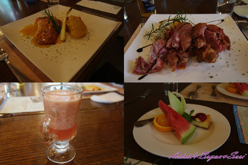 副餐為現打果汁(下圖左下)、水果甜點拼盤(下圖右下)