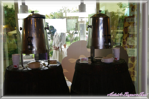 在大門處飯店貼心的準備有冰涼的紅茶及關西特產仙草茶,供旅人享用