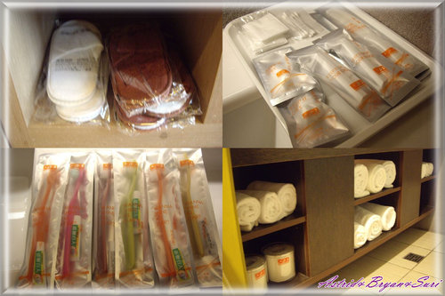 六人份的拖鞋、盥洗用具、毛巾及六個不同顏色的牙刷