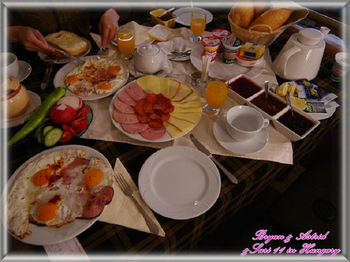 早餐的主角是麵包、cheese、培根、火腿、cereal之屬,